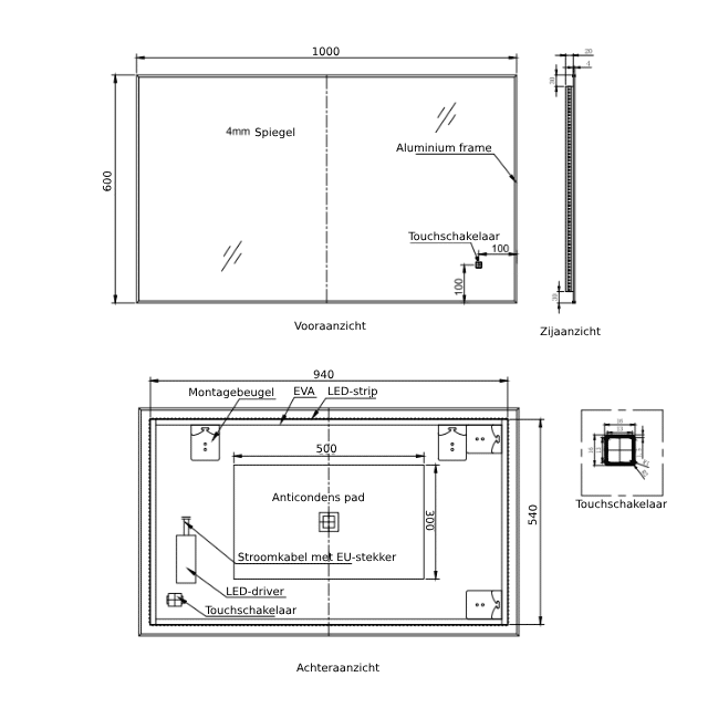 Deze spiegel werkt niet op batterijen, maar op netstroom. Je kunt de LED-verlichting bedienen met een wandschakelaar of eenvoudig via de touch-knop op de spiegel. Gebruik een stekker als je hem liever op een stopcontact aansluit.